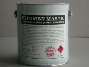 Το Bitumen Mastic είναι ασφαλτική µαστίχη ενός συστατικού. Παρασκευάζεται από άσφαλτο σε συνδυασµό µε ελαστοµερή πολυµερή, ειδικά πρόσθετα, πληρωτικά υλικά και µικρό ποσοστό οργανικού διαλύτη. Η επιφάνεια που δηµιουργείται µετά από την εξάτµιση του διαλύτη δεν προσβάλλεται από αραιά οξέα ή βάσεις και διάφορα χηµικά διαβρωτικά υγρά. Εφαρµογή σε στεγανοποίηση αρµών αλλά και στην σφράγιση των ασφαλτικών µεµβρανών.